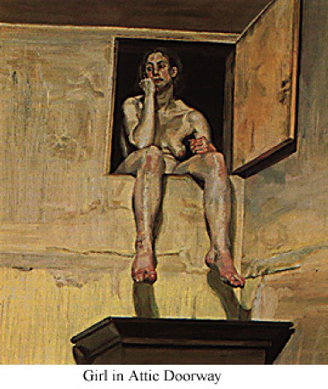 Freud is sufficiently humanistic to record the life that they carry within them, but not interested in telling the story of that life. In a light and unhurried picture like Girl in Attic Doorway, for example, he simply records the peaceful scene. The nude may be waiting for some event, or she may not, but that is not Freud's concern. In spite of his talk of urgency, this is why some critics have seen in his work only the repose and not the movement it contains. William Feaver said to him, 'When you talk about urgency it's pretty tortoise-like,' to which he replied, 'Not to another tortoise.'