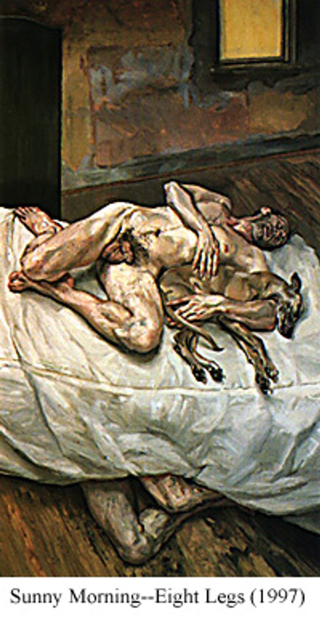 Most of the pieces on display are paintings. The centrepiece of the exhibition is the large 1997 work Sunny Morning--Eight Legs which encapsulates many of the themes and styles of the rest of the display. Here a naked figure (modelled by the painter David Dawson) poses awkwardly on a bed holding a dog. Another pair of legs protrudes from under the bed. The dog is asleep, but the man holding her is awake and staring away from the viewer. The repose of the figures is not a comfortable one.