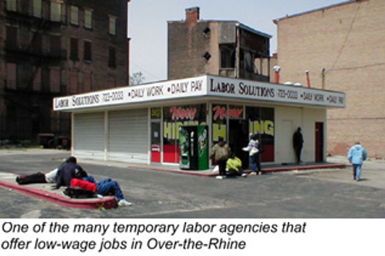The poverty rate in Over-the-Rhine approaches 95 percent, and the area houses many of the city’s homeless shelters, soup kitchens and drug and alcohol rehabilitation centers. A drive through the neighborhood provides a picture of destitution and desperation, with trash-filled lots, abandoned houses and storefronts and dozens of unemployed young men congregating on street corners with nothing to do. Most of those who work rely on the dozens of the low-paying day labor and temporary agencies that dot the neighborhood.