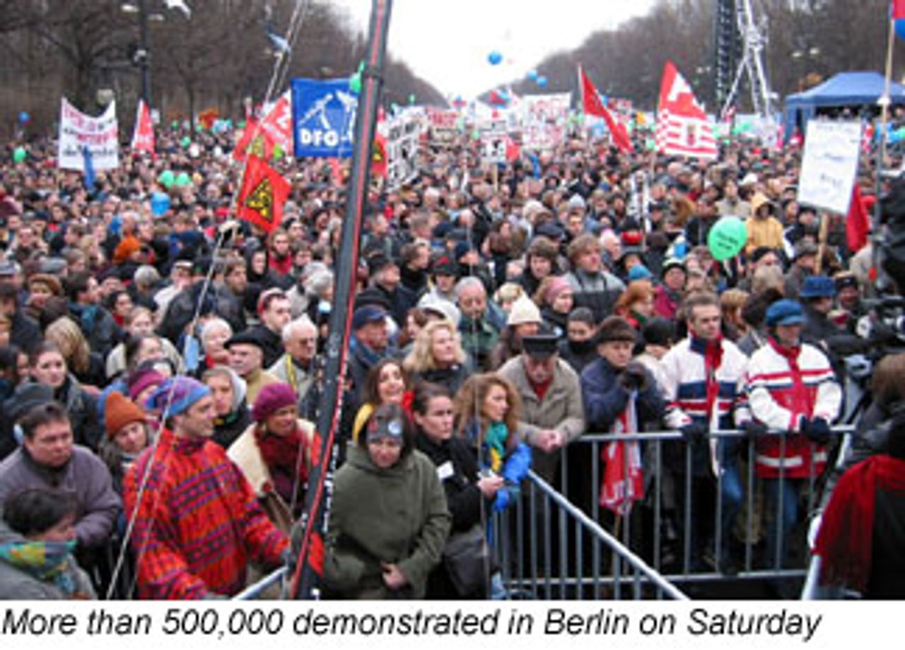 According to official police figures, which generally underestimate the size of such demonstrations, more than a half million people gathered in Berlin on Saturday for the main protest in Germany against a war on Iraq. Demonstrators assembled in both the east and west of the city, and because of the huge numbers in attendance, the marches were forced to leave for the central rally earlier than planned. In the early afternoon the entire centre of Berlin, on both sides of the historic Brandenburg Gate, was teeming with protesters.