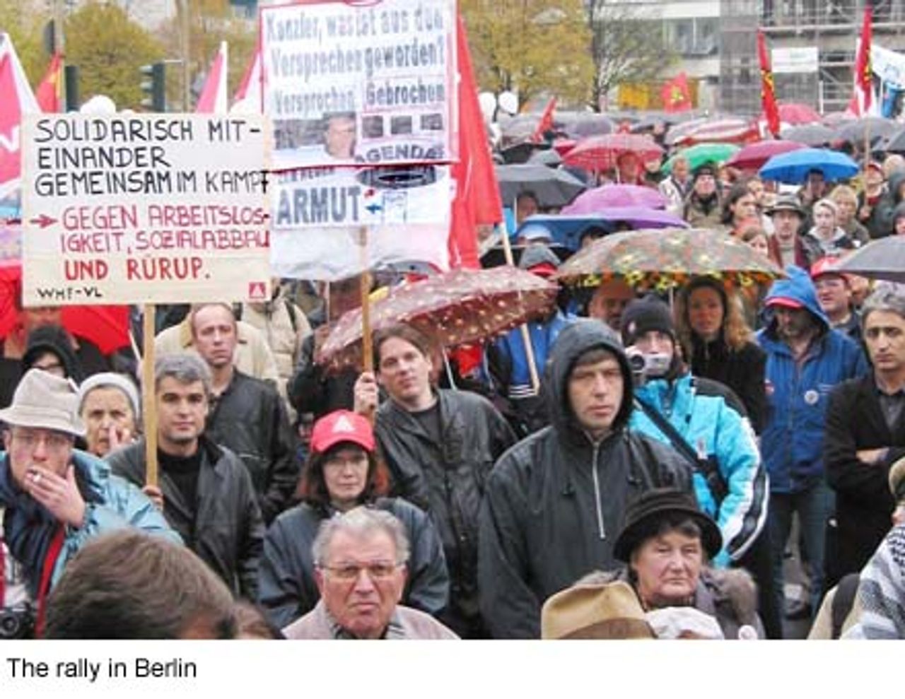 In the event, 300 buses came from across Germany, bringing people to the biggest demonstration in Berlin since the massive anti-war mobilisation in the spring of this year. Large numbers of senior citizens marched alongside tens of thousands of young people and entire families to express their anger and disgust at government plans for the dismantling of social provisions and guarantees that had their origins in the “carrot-and-stick” policies of German chancellor Bismarck 130 years ago.