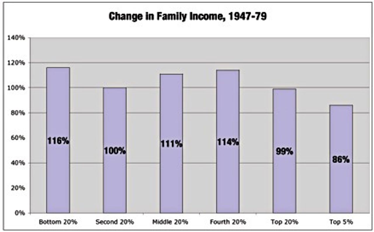 Chart 1 traces the change in family income between 1947 and 1979. These statistics show that the robust expansion of the American economy in the aftermath of World War II raised the family income of all sections of the population. The families whose income placed them in the lowest 20 percent realized a 116 percent increase in their income. The second 20 percent realized a 100 percent increase. The middle 20 percent saw a 114 percent increase. The top 20 percent saw a 99 percent increase and the top 5 percent realized an increase in family income of 86 percent. So we see that all sections of the population benefited substantially from the economic growth that followed the war, and, at least in percentage terms, the greatest gains were realized by the lower 80 percent of the people.