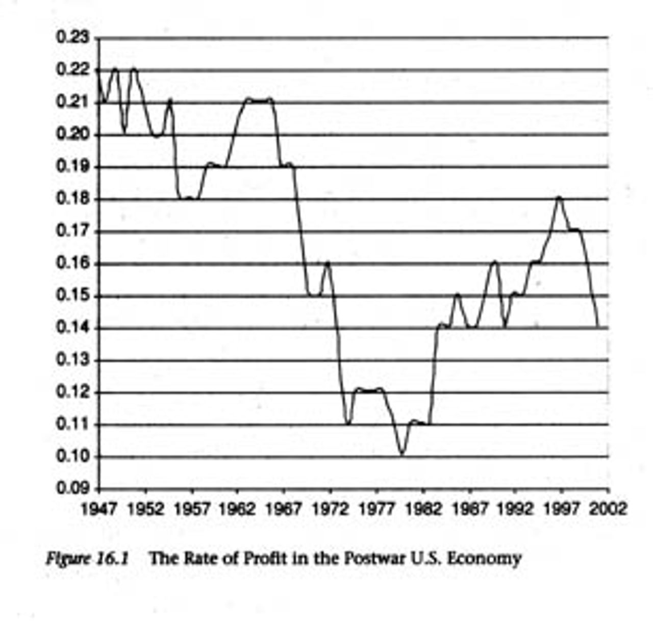 According to one analysis, the US rate of profit stood at 22 percent at the start of the post-war boom, before undergoing a decline in the period from 1967 to 1977, when it stood at about 10 percent. Since then, despite the most strenuous efforts by both employers and the state to suppress real wages and to introduce new technologies, the rate of profit has risen to just 14 percent after a brief spurt in the 1990s. (See Fred Moseley, “Marxist Crisis Theory and the Postwar US Economy” in Anti-Capitalism Alfredo Saad-Filho ed. p. 212)
