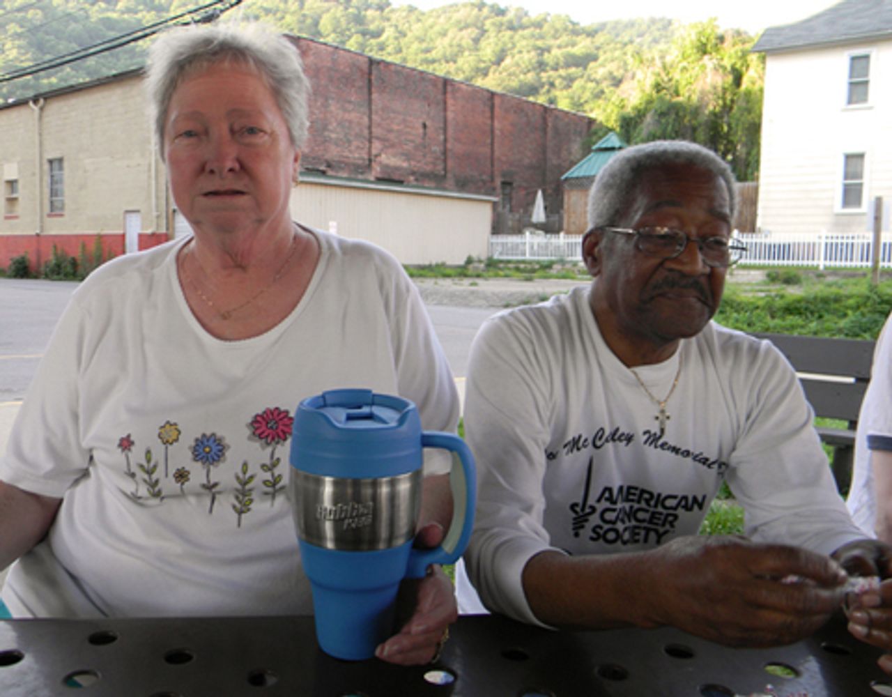Juanita Barker and Ronald Childress. Behind them stands the gutted Olympic Opera House, where theater troupes from New York and Cincinnati once performed.“We had all kinds of shops in town—Murphy’s, Halls Department Store, a JC Penney’s, Cox’s Department store. We had a Sears Roebuck that moved out. We had three or four grocery stores; now to buy groceries you have to go out of state,” he said, indicating toward the bridge across the Tug Fork River to Kentucky. “I wouldn’t dare walk that.”