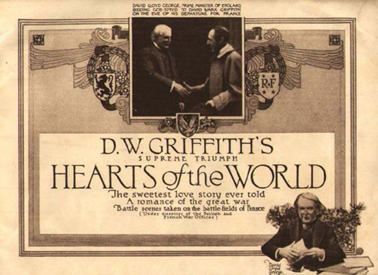 Hearts of the World (D.W. Griffith)That the director of the pacifist Intolerance could turn around and make the pro-war Hearts of the World two years later illustrates the political and economic pressures facing US filmmakers and their corporate subsidizers after 1916. During the first three years of World War I, the US film industry suffered losses by the closing off of certain European territories, war shortages, regulations and war-related disasters. Shrewd studio leaders understood the long-term value of the war. Unlike European film companies, the US studios enjoyed an unimpaired home market and predicted a decline in film imports as a result of the war. As German, Italian and British film production plummeted, Hollywood envisioned its own world market for the first time. [2]
