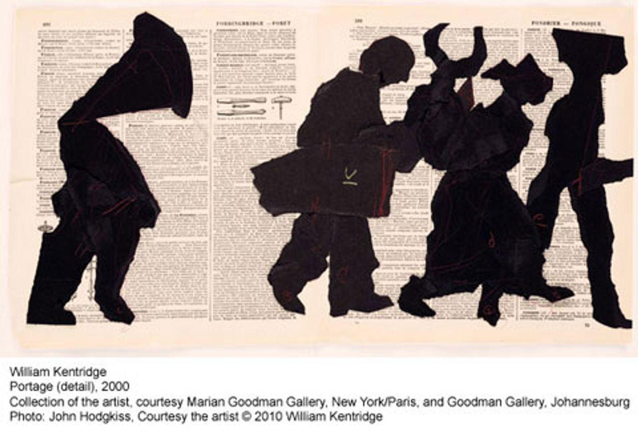 Kentridge first gained international attention in the early 1990s with his unique animated drawings—he has called them “stone-age animation”—depicting the uprisings against apartheid in South Africa. He drew and erased his charcoal drawings, recording the development with stop action film to create videos that are literally “moving pictures.” Some of the videos also include black-paper silhouettes, figures drawn in white chalk, as well as black and white news footage and documentary sound.