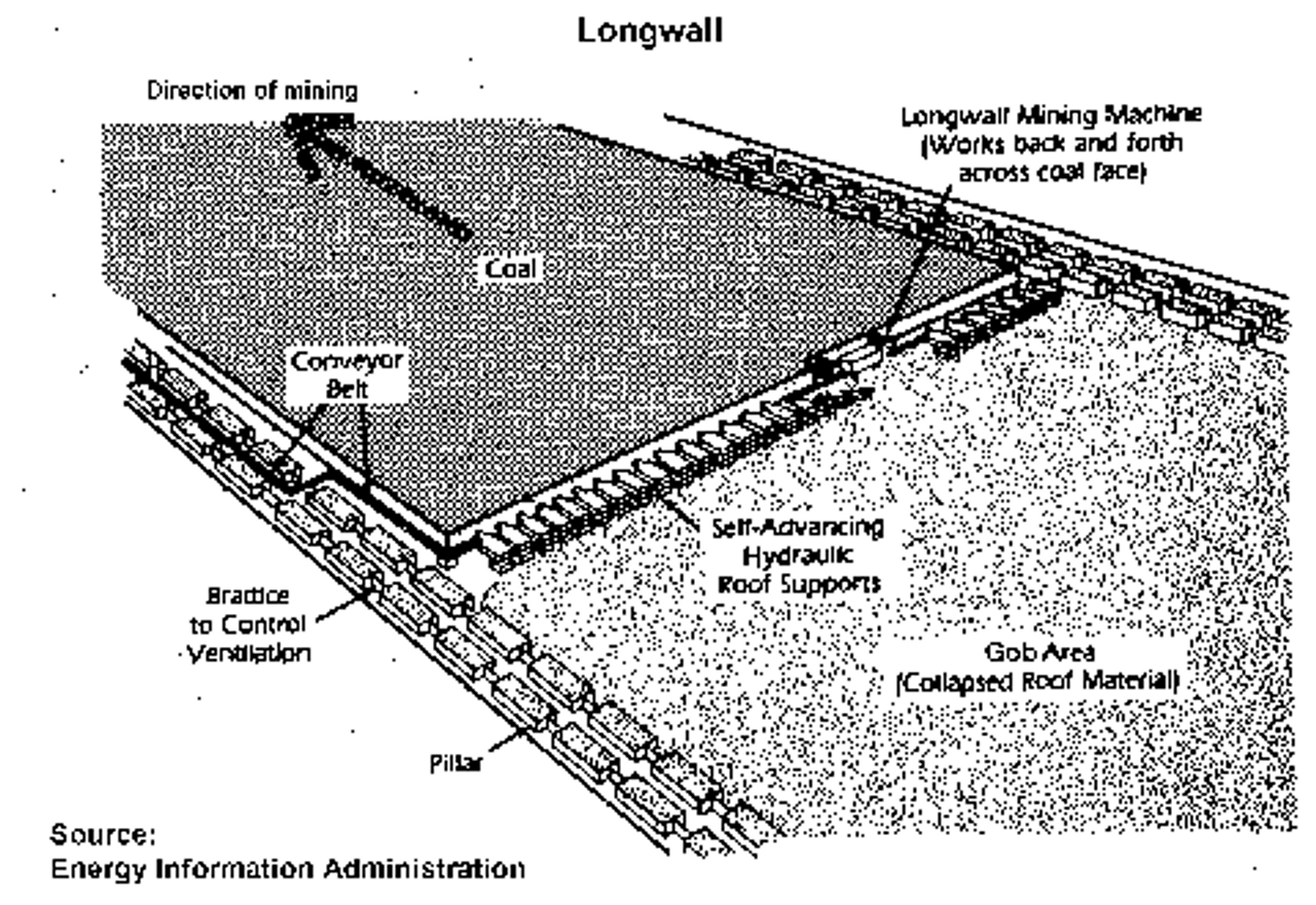 Mining is done towards the entrance of the mine. Hydraulic jacks support steel covers that hold up the roof. As the coal is dug, the tracks, shearer and jacks are all moved forward. As the longwall miner digs through the coal seam and moves forward, the roof caves in behind the miner.