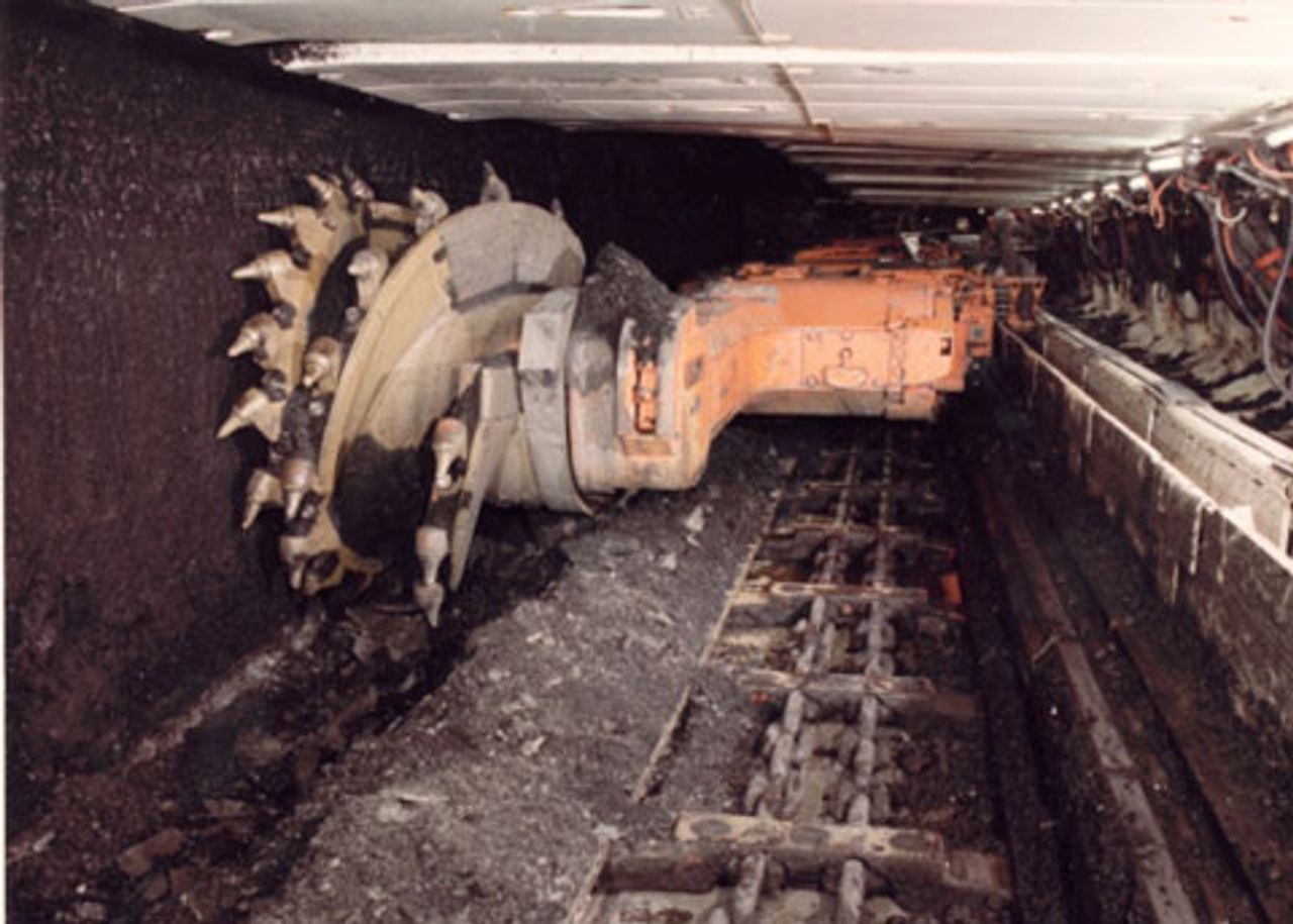 The shearer, the part of the longwall that actually digs the coal, is a giant set of rotating drums with dozens of bits that dig the coal and rock. The bits are composed of a steel shank with a carbide tungsten tip. It is important that this tip be in place as a safety measure, because when a carbide tungsten tip hits rock it does not spark the way steel does. The seam being mined at the UBB mine was so narrow that the longwall machine was hitting sandstone continuously.