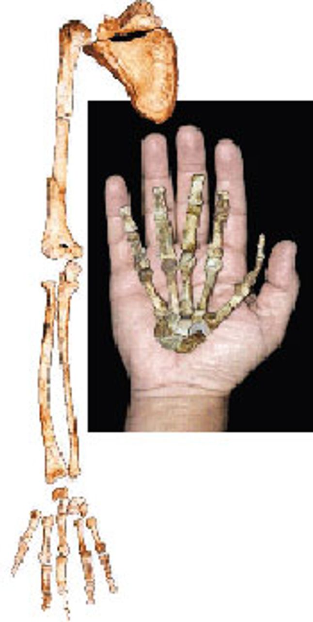 A nearly complete specimen of the right hand and wrist from the adult female includes a relatively lengthened thumb while the other fingers are shorter, a trend begun in earlier australopithecines such as Lucy, along with other, more advanced characteristics, according to the analysis presented by the discoverer. This reduced difference in length between the digits would have enhanced the ability to oppose the thumb to the other fingers facilitating the “precision grip” that is characteristic of humans and necessary for the production of sophisticated tools and other manipulative activities. At the same time, the hand retains a relatively flexed configuration useful in tree climbing, characteristic of other australopithecines and of apes, but not of Homo.