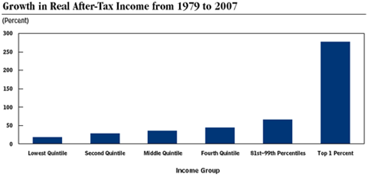 • Average inflation-adjusted after-tax income for the 1 percent of the population with the highest income grew by 275 percent from 1979 to 2007. Their share of national income rose from nearly 8 percent in 1979 to 17 percent in 2007.