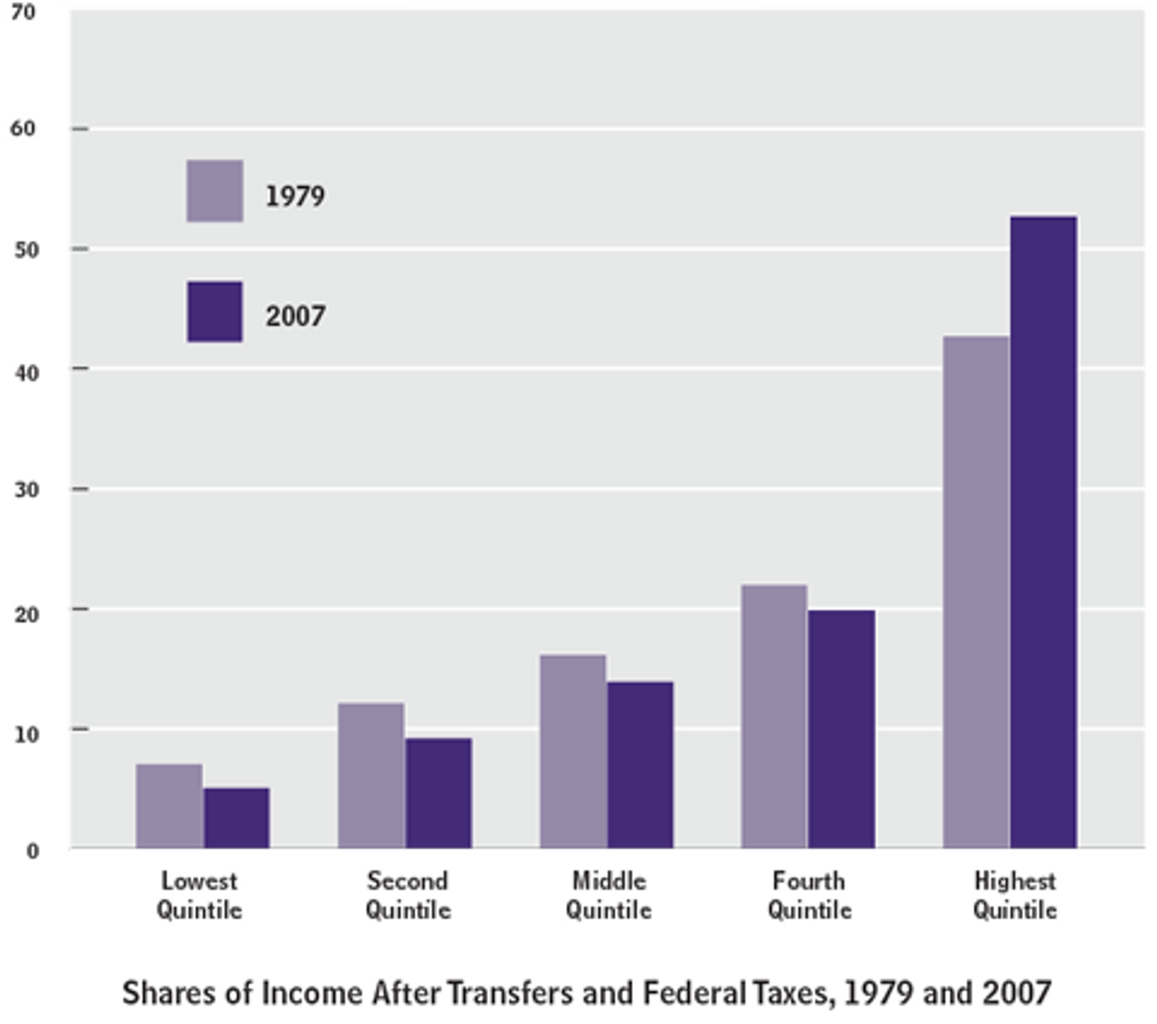 • For the poorest fifth of the population, average real after-tax household income rose by only 18 percent between 1979 and 2007. Their share of national income was about 5 percent, down from 7 percent in 1979.