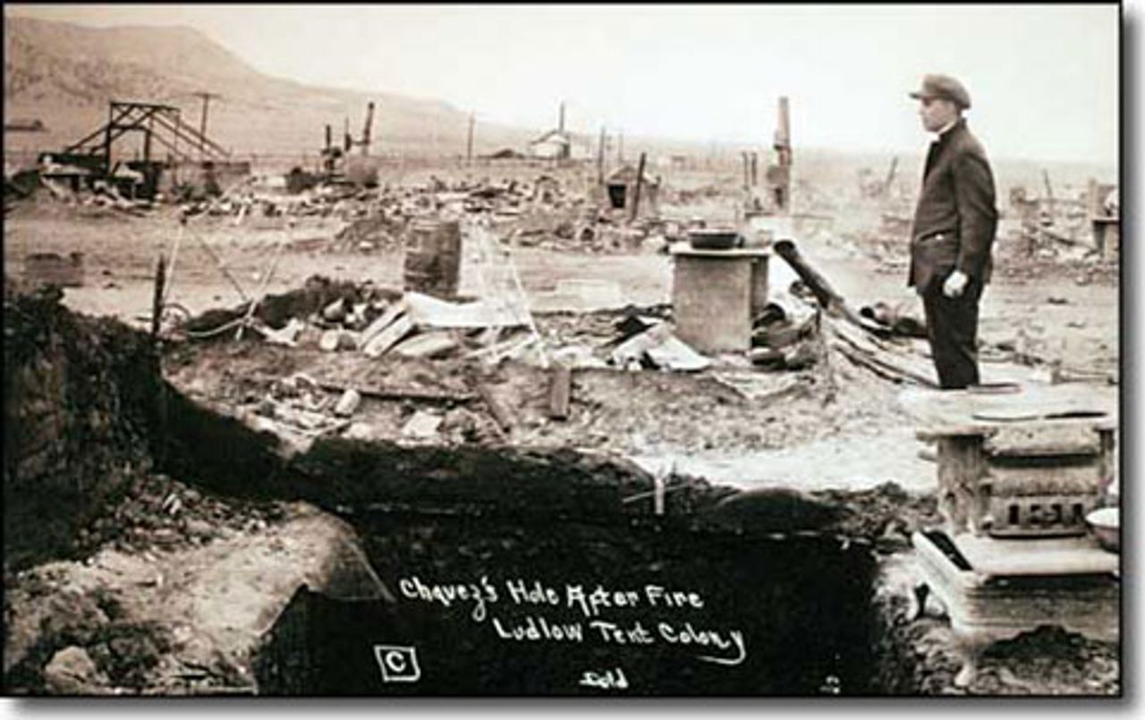 Workers were forced to retreat, and company agents and guardsmen began to set fire to the tents in Ludlow. Fires raged, destroying the city. The remaining inhabitants of the tents began to flee across a field to the East.