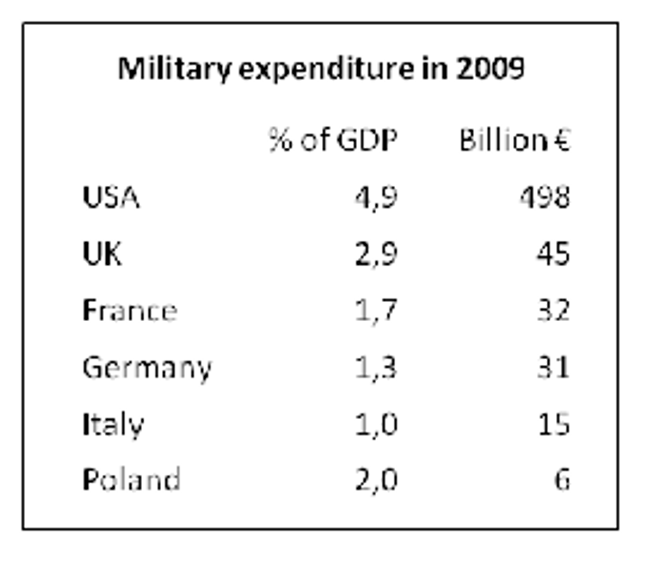මිලිටරි කාරනා වලදී බි්රතාන්ය හා ප්රන්සය තවමත් ප්රමුඛත්වය දරයි. ජර්මනිය මිලිටරි පිරිවැය සඳහා යොදවන්නේ දල දේශීය නිෂ්පාදිතයෙන් සියයට 1.3ක් පමනි. ප්රන්සය හා බි්රතාන්ය සියයට 1.6ක් හා 2.8ක් වැය කරති. ඒ අනුව දෙරටේ ඒකාබද්ධ පිරිවැය ජර්මනිය මෙන් තුන් ගුනයකටත් වැඩිය. කෙසේ වෙතත් ඒ දෙරටම එක්සත් ජනපදය හමුවේ අඟුටු මිට්ටන් බවට පත් වෙයි. එරට මිලිටරි පිරිවැය වෙනුවෙන් දදේනි සියයට 5ක් පමන වැය කරයි.
