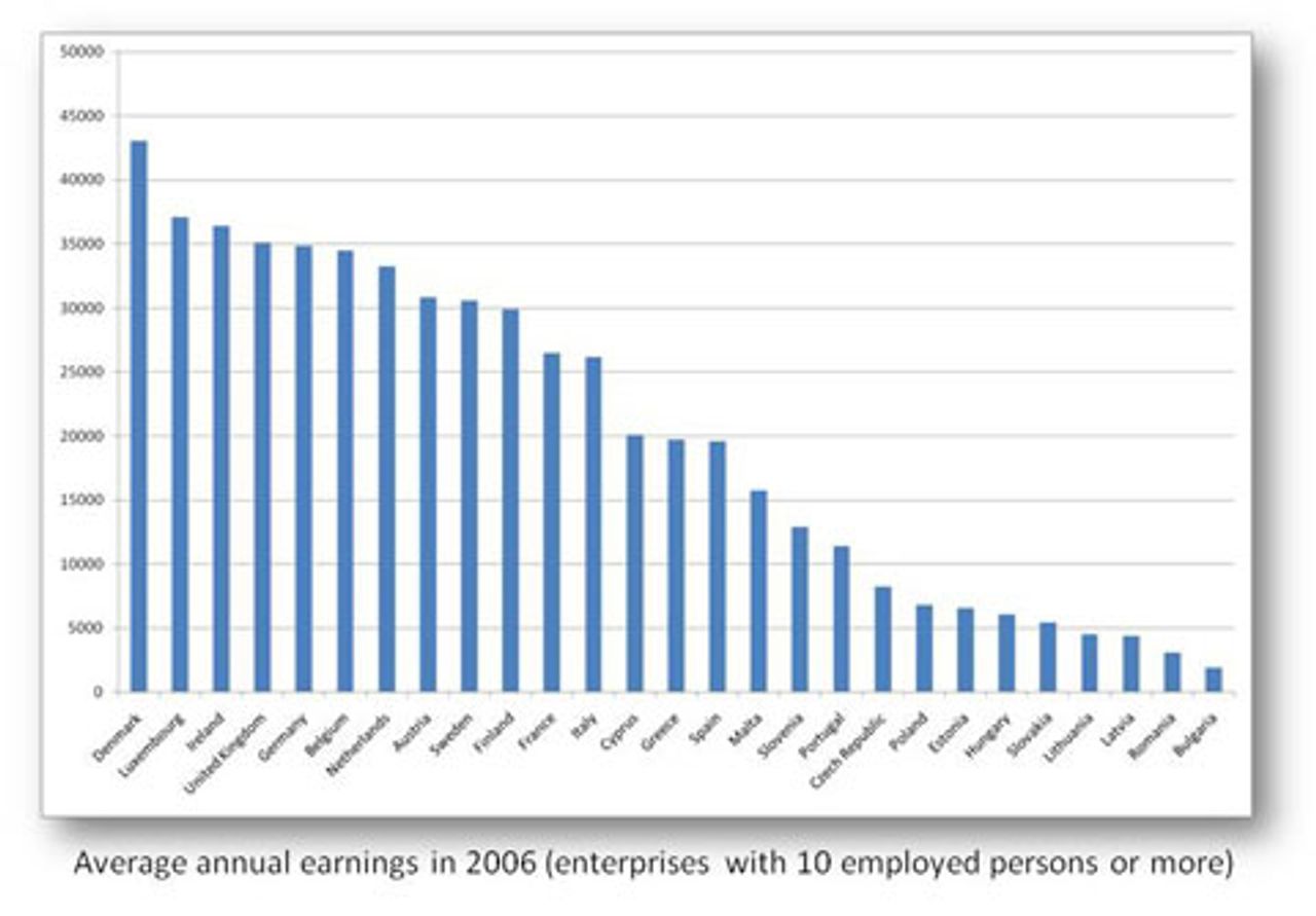 2006 වසරේ සේවකයින් දහයක් හෝ වැඩි ගනනක් සේවයේ යෙදවූ සමාගමක පූර්න කාලීන සේවකයෙක් වාර්ෂිකව ලැබූ සාමාන්ය ආදායම පහත වගුවෙන් පෙන්නුම් කෙරේ. වැටුප් ඩෙන්මාර්කයේ යුරෝ 43,000 සිට බල්ගේරියාවේ යුරෝ 1,300 දක්වා පරාසයක විය. ඒ අනුව බල්ගේරියාවේ කම්කරුවෙක් ඉපයුවේ සිය ඩෙන්මාර්ක සගයාට වඩා විසි ගුනයකින් අඩු මුදලකි. ග්රීසිය හා ස්පාඤ්ඤය ඒ අතර මැද යුරෝ 20,000ක් විය. මෙය ඩෙන්මාර්කයේ වැටුපෙන් අඩකටත් වඩා අඩු ප්රමානයකි. එහෙත් තවමත් බල්ගේරියාවේ වැටුපෙන් දහ ගුනයකටත් වැඩි විය.