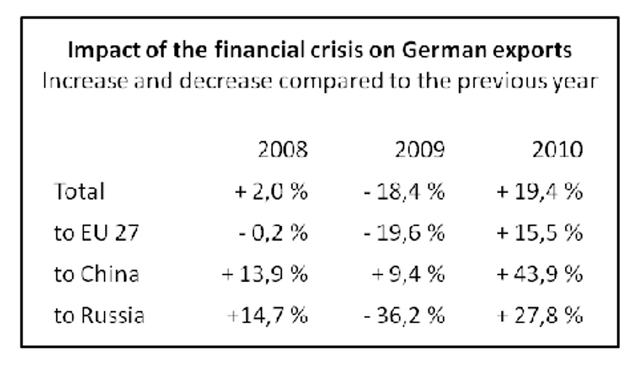 2009දී ජර්මනියේ අපනයන ආර්ථික අර්බුදයේ ප්රතිපල වශයෙන් සියයට 19න් පහත වැටුනි. 2010දී එරට මෙම අලාභ පියවා ගත්තේ, 2008 සාපේක්ෂව වාර්තාගත සංඛ්යා අත්පත් කර ගනිමිනි. එහෙත් යුරෝ කලාපයට යැවුනු අපනයන වැඩිවූයේ සියයට 14න් පමනි. එය අර්බුදයට පෙරාතු කාලයේ මට්ටමට වඩා පහතින් පැවතුනි. මේ අතර චීනයට කල ජර්මානු අපනයන සියයට 44න් ද රුසියාවට සියයට 28න් ද ඉහල ගියේය.