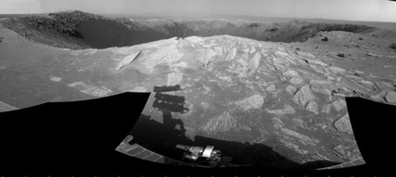 අඟහරු මත සැන්ටා මාරියා නරාව [අනුග්රහය: නාසා]අඟහරුගේ පෘෂ්ටය මත පවතින දැරිය නො හැකි කොන්දේසි මගින් නිර්බාධිතව ඔපොචියුනිටි යන්ත්රය සිය ගවේෂන දිගට ම කරගෙන යයි. මේ මාසය මැද වනවිට එය මීටර 100ක පමන විෂ්කම්භයකින් යුත් සැන්ටා මාරියා නමැති නරාවක ගිනිකොන දිග අන්තයට ලඟා වී තිබුනි.
