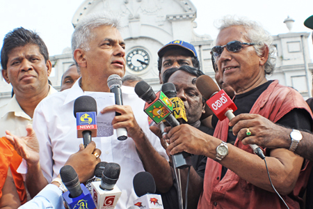 කරුනාරත්න, වික්රමසිංහට මයික්රෆෝනය අල්ලා උදව් කරයිකරුනාරත්න තම කතාවෙන් පසුව, එජාප නායක රනිල් වික්රමසිංහට මුක්කුව දුන්නේ ය. එජාපය යටතේ තරුනයන්ට මැෂිමකින් වගේ රැකියා නිෂ්පාදනය කර දෙන බවටත් ඉදිරි අයවැයෙන් පුද්ගලික අංශයට වැටුප් වැඩිවීමක් අවශ්ය බවටත්, වික්රමසිංහ කල බොරු දෙඩවීමට ජයවේවා, ජයවේවා කියමින් මයික්රෆෝනය අල්ලා උදව් කලේ කරුනාරත්නයි.