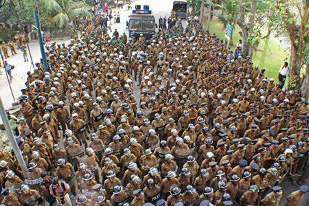 අගෝස්තු 14 දා ආන්ඩුව දැවැන්ත කැරලි මර්දන පොලිස් බට පිරිසක් පෙල ගස්වා තිබු අයුරුජනාධිපති මහින්ද රාජපක්ෂගේ ආන්ඩුව හමුදාව යොදවා වැලිවේරියේ විරෝධතාවය මැඞීමට එල්ල කල ප්රහාරයෙන් තරුනයන් තිදෙනෙක් මරා දැමුනු අතර 40කට පමන තුවාල සිදු කෙරින. ආන්ඩුව ගැන ද හමුදාව ගැන ද රටපුරා වැඩ කරන ජනයා හා තරුනයන් අතර පැතිර ගියේ බරපතල කෝපයකි. එජාප නායකත්වයෙන් පැවති විරෝධතාවට විශාල සෙනගක් රැස්වෙතැයි සිතූ ආන්ඩුව දැවැන්ත කැරලි මර්දන පොලිස් බට පිරිසක් පෙල ගස්වා තිබුනි.