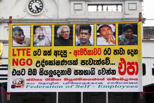 විරෝධතාවයට විරුද්ධව ආන්ඩුව ප්රදර්ශනය කරකර තිබූ දැන්වීමවිරෝධතාව කඩාකල්පපල් කිරීමේ ප්රයත්නයක ආන්ඩුව කල්ඇතිව ම නිරතව සිටියේ කම්කරුවන් හා දුගීන්ගේ අයිතීන්ට පහරදීමේ වැඩපිලිවෙල පස්සට නොගන්නා බව ඇඟවුම් කරමිනි. "දේශද්රෝහී අලි-කොටි ගිවිසුම යලි ක්රියාත්මකයි", "ජිනීවා මානව අයිතිවාසිකම් රට ඇතුලෙම රඟ දැක්වීම ඇරඹෙයි" යන හෙඩිම යටතේ නරුම ලෙස වර්ගවාදය ඇවිස්සීමේ පත්රිකාවක් ශ්රී ලංකා නිදහස් පක්ෂයේ වෘත්තීය සමිති සංවිධානයක් විරෝධතාවට කලින් දිනයේ බෙදා හැරියේ ය.