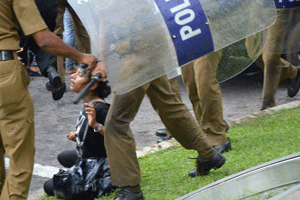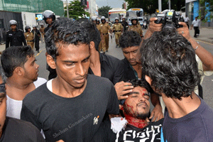 ගැහැනු ලමයින්ට දනහිසින් පහලට ගහල බිම වැටුනම ඒත් ගැහුවා /ඡායාරූප අනුග්රහය: ෂෙහාන් ගුනසේකරඋද්ඝෝෂනයට සහභාගී වූ ජයවර්ධනපුර සරසවියේ ශිෂ්යයෙකු වන රොෂාන් ලෝක සමාජවාදී වෙබ් අඩවියට (ලෝසවෙඅ) කතාකරමින් තම අත්දැකීම විස්තර කලේය: “අපිට ඇමති හමුවෙන්න විධියක් නෑ ඒ නිසා විසිරිලා යන්න කියල පොලිස් ලොක්කෙක් කිවුව. අපි කිවුව අපිට ඇමතිව හමුවෙන්නේ නැතුව යන්න බෑ කියල. ඉන්න එපා හිටියොත් කුඩුවෙන්න ගහනවා කියල එයා කිවුව. එතකොට සිසුන් කීප දෙනෙක් පොලිස් බැරියර් එක හොලවන්න ගත්තම ඒක වැටුනා. එත් එක්කම පොලිසිය අධිපීඩන ජල ප්රහාර එල්ල කලා. කඳුළු ගෑස් ගැහුවා. කඳුළු ගෑස් ඈතට ගහලා ඉස්රහින් හිටපු ශිෂ්යයෝ කොටු කරල බැටන් පොලු වලින් සිසුන්ට ගැහුවා. මටත් බැටන් පාරවල් කීපයක්ම වැදුන. දුවන සිසුන් හඹාගෙන ඈතට එලවාගෙන ඇවිත් පොලුවලින් ගැහුවා. අල්ලගත්ත සිසුන් පොලිස් වාහනය ලඟ තියාගෙන අතින් පයින් ගැහුවා. ගැහැනු ලමයින්ට දනහිසින් පහලට ගහල බිම වැටුනම ඒත් ගැහුවා. සිසුන් දෙන්නෙක්ගේ ඔලුව පැලුනා. 30කට වැඩිය දෙනෙක්ට බේත් දාන්න සිද්ධ වුනා. ඊයේ වෙනකොටත් 6 දෙනෙක් රෝහලේ නැවතිලා ප්රතිකාර ගත්ත.”