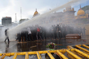 කඳුලු ගෑස් සහ ජල ප්රහාර එල්ල කරමින් පොලිස් ප්රහාරය ආරම්භවිය /ඡායාරූප අනුග්රහය: ෂෙහාන් ගුනසේකරකුලු පොලු සහිතව සිටි 200 කට අධික පොලිස් භටයන්ගෙන් හා ජල විදින යන්ත්රයන්ගෙන් සන්නද්ධව සිටි පොලිස් කැරලි මර්දන ඒකකය මාර්ග බාධක යොදා සිසුන් අමාත්යංශයට ඇතුලුවීම වලකාගෙන සිටි අතර සිසුන් වෙතට පැමිනි ඉහල පොලිස් නිලධාරියෙක් ඇමතිවරයා හමුවීමට නොහැකිබව පවසමින් වහා විසිර යන ලෙස සිසුන්ට විධානය කලේය. එය ප්රතික්ෂේප කල සිසුන් මාර්ග බාධකය ඉවත් කිරීමට යත්න දරනවාත් සමගම කඳුලු ගෑස් සහ ජල ප්රහාර එල්ල කරමින් පොලිස් ප්රහාරය ආරම්භ විය. ප්රහාරයෙන් ආරක්ෂාවීම සඳහා දිවගිය සිසුන් හඹා ගිය පොලීසිය ඔවුනට කුරිරු ලෙස පහර දුන්නේ ස්ත්රී පුරුෂ භේදයක් නොතකාය. පහර කෑ බිම වැටී සිටි සිසුවියන්ට ද පහර දුන් පොලීසිය ඔවුන් බිමදිගේ ඇදගෙන ගොස් පොලිස් ට්රක් රථ වලට නංවා ගත්හ. ප්රහාරයෙන් තුවාල ලද සිසුන් 6 දෙනකු රෝහල් ගත කෙරුනු අතර සිසුන් 39 දෙනෙකු පොලිස් අත්අඩංගුවට ගැනින.