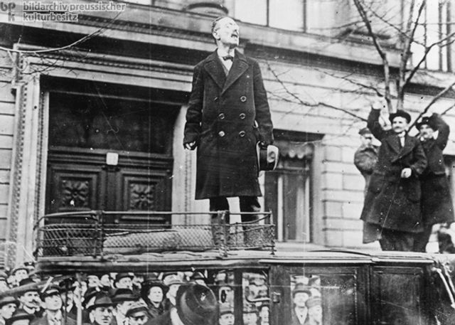 1914 අගෝස්තුවේ පුපුරා ගිය අධිරාජ්යවාදී යුද්ධයට විරුද්ධවූ ජර්මනියේ ස්පාටකස් ලීගය නම් විප්ලවවාදී සමාජවාදී සංවිධානය, 1916 මැයි 1දා , සමාජවාදී හා යුද විරෝධී ක්රියාමාර්ගයක් සහිතව බර්ලිනයේදී දැවැන්ත පෙලපාලියක් මෙහෙයවීය. සංවිධානයේ වඩා ප්රමුඛ නායකයෙක් වූ කාල් ලිබ්නෙක්ට්, ජර්මානු මිලිටරිවාදයට චෝදනා කරමින් කථාවක් පැවැත්වීය. විදේශයේදී ජර්මානු අපරාධ සමඟ අත්වැල් බැඳගෙන රට තුල සමාජ හා ප්රජාතන්ත්රීය අයිතීන්ට එල්ල කල ප්රහාර ඔහු හෙලා දුටුවේය.