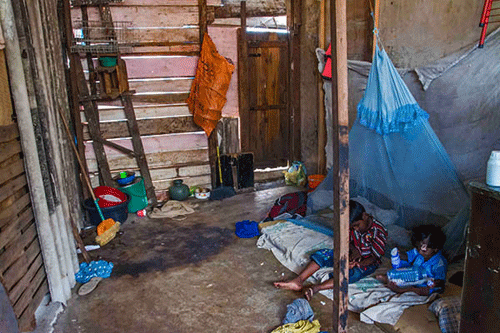 “ලමයි තුන් දෙනාටම දරුනු ලෙස හතිය තියෙනව. රිජ්වේ රෝහලෙන් අපිට දුන්නු රිපෝට් පෙන්නලා මන්තී්රවරුන් ගනනාවක් ලඟට ගිහින් තමයි මෙහෙ පැල්පතට ආවේ. ඊට කලින් අපි පේමන්ට් එකෙත් හිටිය, පැල්පත් කීපයකම කුලියටත් හිටිය. මහත්තය කුලී වැඩ කරන්නේ, දිනකට ලැබෙන්නේ රු. 500-700 වගේ ගානක්, ඒකෙන් පැල්පතක කුලිය හෝ අත්තිකාරම ගෙවන්න හරිම අමාරුයි. මෙහෙම ලබා ගත්තු ගේ තමයි තමයි පෙබරවාරි 16 කුඩු කරලා දැම්මේ.