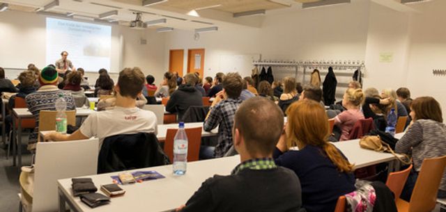 දුසිම් ගනන් ශිෂ්යයෝත් කම්කරුවෝත් දේශන කාමරයට පිරී, "සිරියානු යුද්ධය සහ මැද පෙරදිග තුල ජර්මානු අධිරාජ්යවාදයේ අරමුනු" යන මැයින් ලෝක සමාජවාදී වෙබ් අඩවි සංස්කාරක මන්ඩලයේ සාමාජික ජොහැන්ස් ස්ටර්න් පැවැත්වූ පලමු දේශනයට සාවධාන ව සවන් දුන්හ.