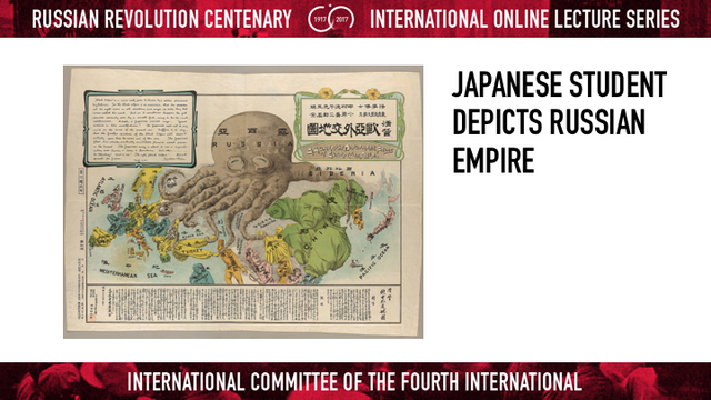 මංකොල්ලය සහ භෞමික ප්රසාරනය අරමුනු කරගත් අධිරාජ්යවාදී යුද්ධ වලින් පිටවී සිටීමට රුසියානු අධිරාජ්යයට නො හැකි විය. මෙහි දැක්වෙන පින්තූරය පෙන්නුම් කරන්නේ එකල්හි රුසියානු අධිරාජ්යවාදය, රටවල් ගනනාවක් හිරකොට අඬුපඬු දික්කරගත් යෝධ බූවල්ලෙකු ලෙස ජපන් ශිෂ්යයෙකුට පෙනීගිය ආකාරයයි. ඉහල වමේ පෝලන්තයේ පටන්, තුර්කිය, පර්සියාව සහ ටිබටය තුලට අඬු විහිදී තිබේ. එක අන්ඩක් චීනයට විහිදී ඇති අතර තවෙකක් කොරියාව සමහරවිට ජපානය දක්වා විහිදී ඇත.