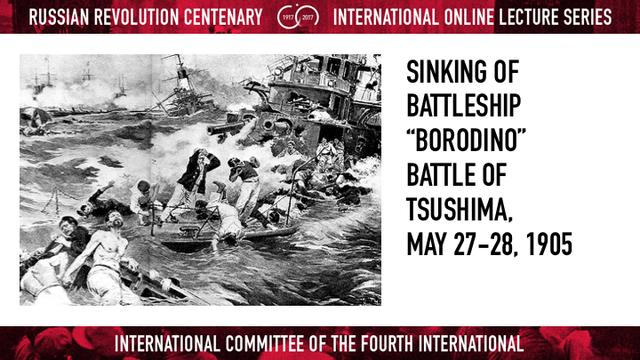 “ට්සුෂිමා දිවයිනේ පිලිකුල් සහගත සටනෙන් පසුව, රුසියනු නැව් හමුදාව තවත් ඉතුරුව නැත. සාර්ගේ අපරාධවල ගොදුරක් හැටියට අපකීර්තිමත්ව වැනසී ගිය රුසියානු යුද නැව්වල සිටි, අපගේ සොයුරන් දහස් ගනනක් ශාන්තිකර මුහුදු පතුලේ වලලා දැමුනි. ඒ සා දැවැන්ත වියදමකින් මිලයට ගැනුනු රුසියානු නැව් හමුදාව අවසාන ය. එතරම්ම වියදමක් දරා නිපදවූ රුසියානු නාවික බල ඇනිය තවත් ඉතිරිව නැත. හැම කුඹගසක්ම ද ඇන- මුරිච්චියක්ම ද සමග වැනසී ඇත්තේ රුසියානු වැඩ කරන ජනතාවගේ ලේ දහඩියයි. සෑම යුද නැවක්ම වසර ගනනාවක ගොවි පවුල්වල දහඩිය මහන්සියයි. සියල්ල මුහුද පතුලට ගිල්වනු ලැබ ඇත. අවාසනාවන්ත මිනිසුනුත්, ඔවුන්ගේ දෑතින් නිමවන ලද නිෂ්පල සම්පතුත් ගිල්වා දමා තිබේ. .... නිර්ලජ්ජිත ඝාතනය! යුද්ධයේ පලමු දිනයේ පටන්ම දේශපාලනිකව දැනුවත් කම්කරුවන් විසින් මතුකරන ලද, සියලු කම්කරුවන් හා අව්යාජ පුරවැසියන් අතර දැඩි සහායක් දිනාගත් සටන් පාඨය මතු කරනු.