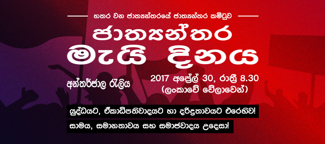 හතර වන ජාත්යන්තරයේ ජාත්යන්තර කමිටුව, ජාත්යන්තර කම්කරු පන්ති සහයෝගිතාවයේ ඓතිහාසික දිනය වන, මැයි දිනය සමරනු පිනිස, අප්රේල් 30 වන ඉරිදා, ජාත්යන්තර අන්තර්ජාල රැලියක් පවත්වනු ඇත. මෙම රැලිය එදින ශ්රී ලංකාවේ වේලාවෙන් රාත්රී 8.30ට wsws.org/mayday සබැඳිය හරහා විකාශනය කෙරෙනු ඇත.