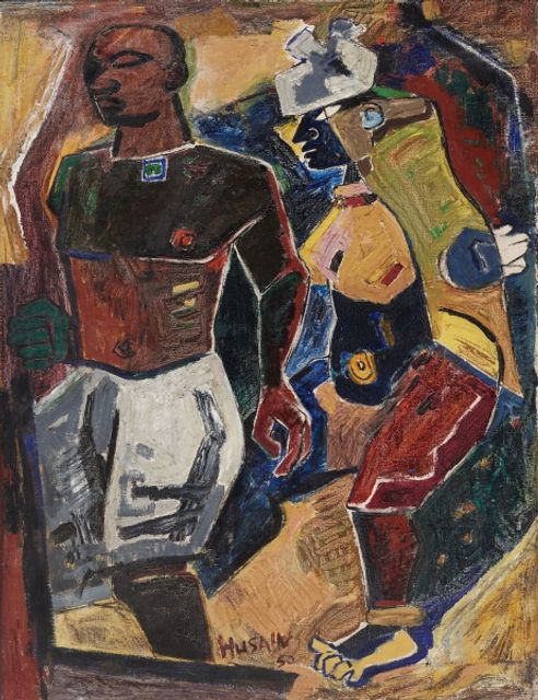 හුසේන්ගේ ගොවි යුවල (1950) ඉදිරියට පා නගන පිරිමියකු හා ගැහැනියක පිලිබඳව ය. ගැහැනිය ඇගේ පිටේ යමක් රැගෙන පිය නගන බව පෙනෙන අතර, පිරිමියා ආයුධයක් හෝ ගොවි ආම්පන්නයක් අතැ’තිව සිටින බව පෙනේ. වර්න පලත්ත බොහෝ දුරට භූමි වර්නයෙන් යුතු අතර, ගැහැනියගේ ඇඳුම්වල උද්දීප්ත කැලතීම් සමහරක් තිබේ. ස්ත්රී රූපය ලබා ගෙන තිබෙන වඩාත් අවෛෂයික කලා නිරූපනයට වෙනස් ලෙස පිරිමියාගේ යථාර්ථවාදී නිරූපනය විශේෂ වන නමුත් බොහෝ දෘෂ්ටිකෝනවලින් නරඹන අයුරින් එම රූප දෙකම විකෘතාකාර වන අතර, ඔවුන්ගේ ඇඳුම් හා ශරීරයන්ගේ හැඩතල හා වර්න පසුතලය සමග සම්බන්ධ වෙමින්, ඔවුන් විද්යමාන වෙමින් මතුවන කොලාජයක් නිර්මානය කරයි.