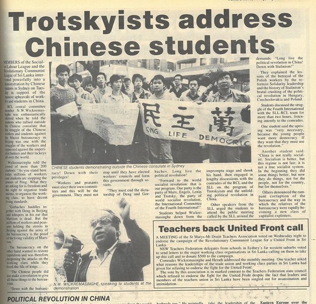 මෙම වැදගත් සිදුවීම් මධ්යයේ, හතරවන ජාත්යන්තරයේ ජාත්යන්තර කමිටුව ජූනි 8 වන දින “චීනයේ දේශපාලන විප්ලවයේ ජයග්රහනය!” සහ ජුනි 22 දා “චීන කම්කරුවන්ට එරෙහි ස්ටැලින්වාදී ත්රස්තවාදය නවත්වනු!” යනුවෙන් ප්රකාශන දෙකක් නිකුත් කලේ ය. එය ස්ටැලින්වාදී ම්ලේච්ඡත්වය හෙලා දුටුවා පමනක් නොව, සිදුවීම් පිලිබඳ පැහැදිලි විශ්ලේෂනයක් සපයා, අවශ්ය පාඩම් උකහා ගනිමින් බීජිං හි පරිහානියට පත් මාඕවාදී නිලධරයට එරෙහිව කම්කරු පන්තියට සටන් කල හැකි දේශපාලන ඉදිරිදර්ශනයක් ඉදිරිපත් කලේ ය.